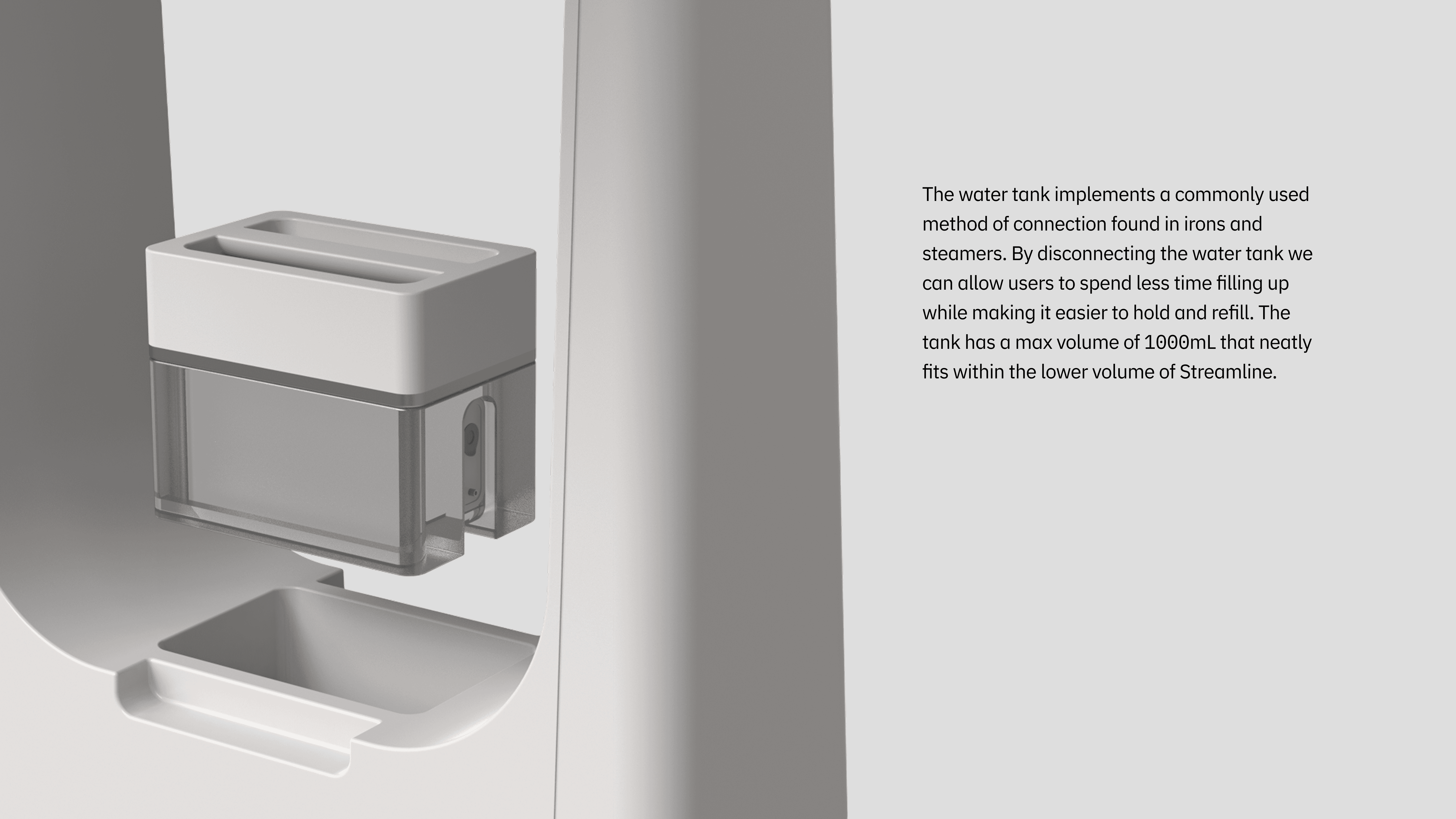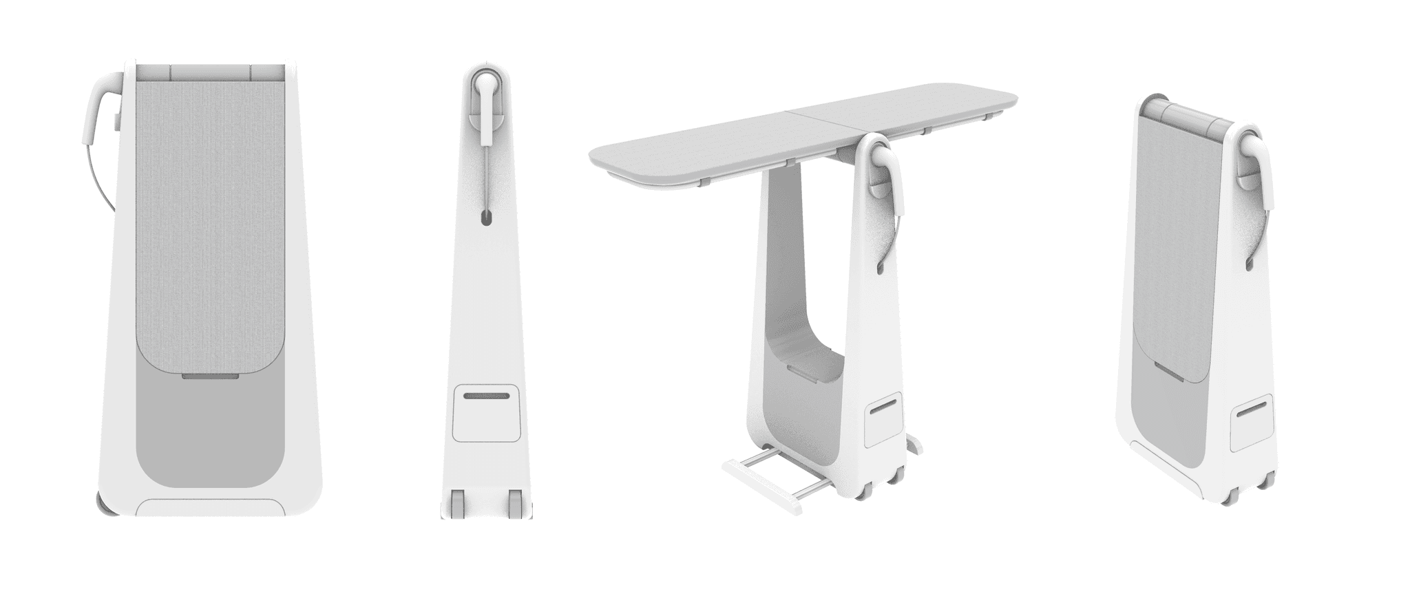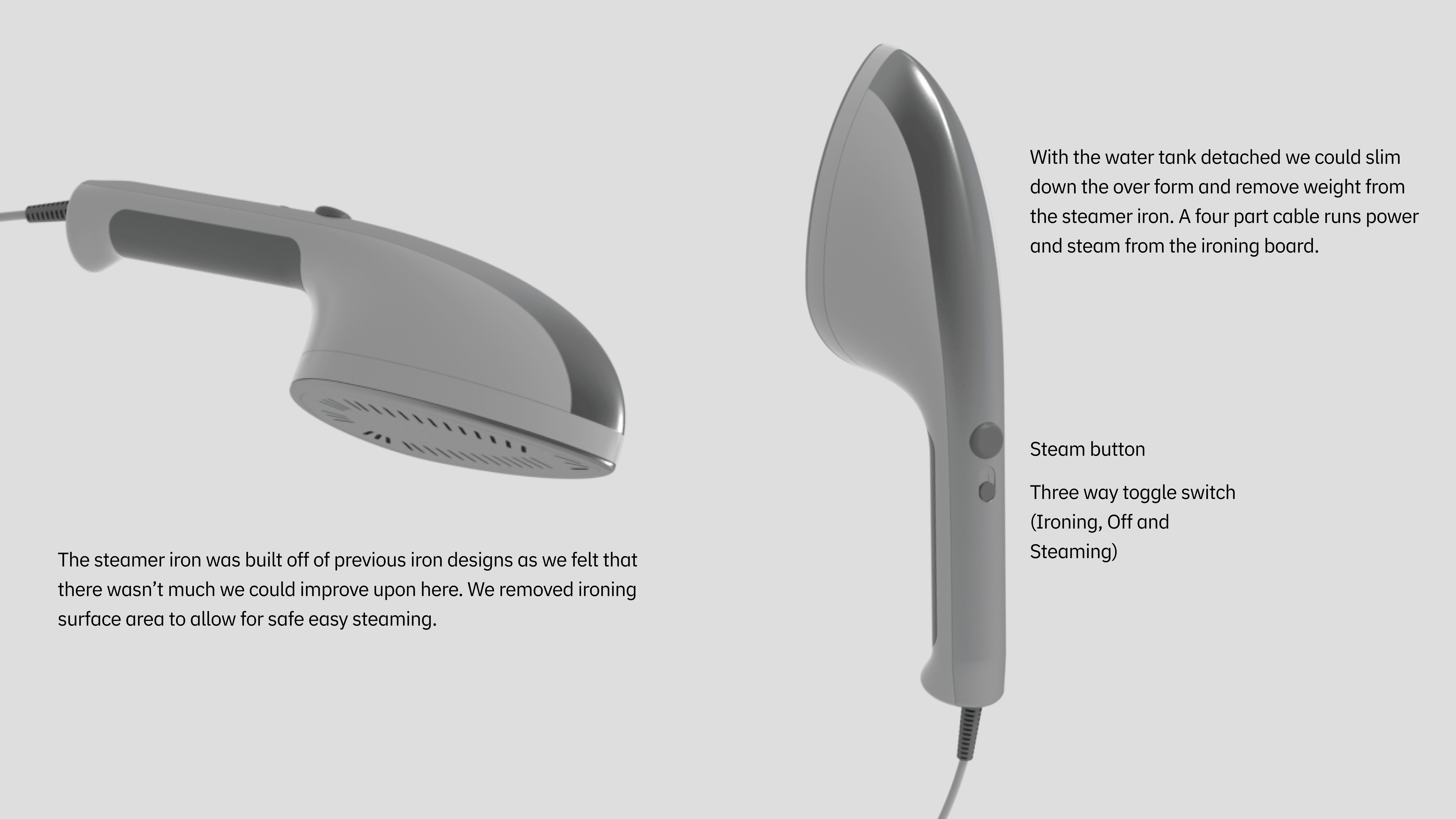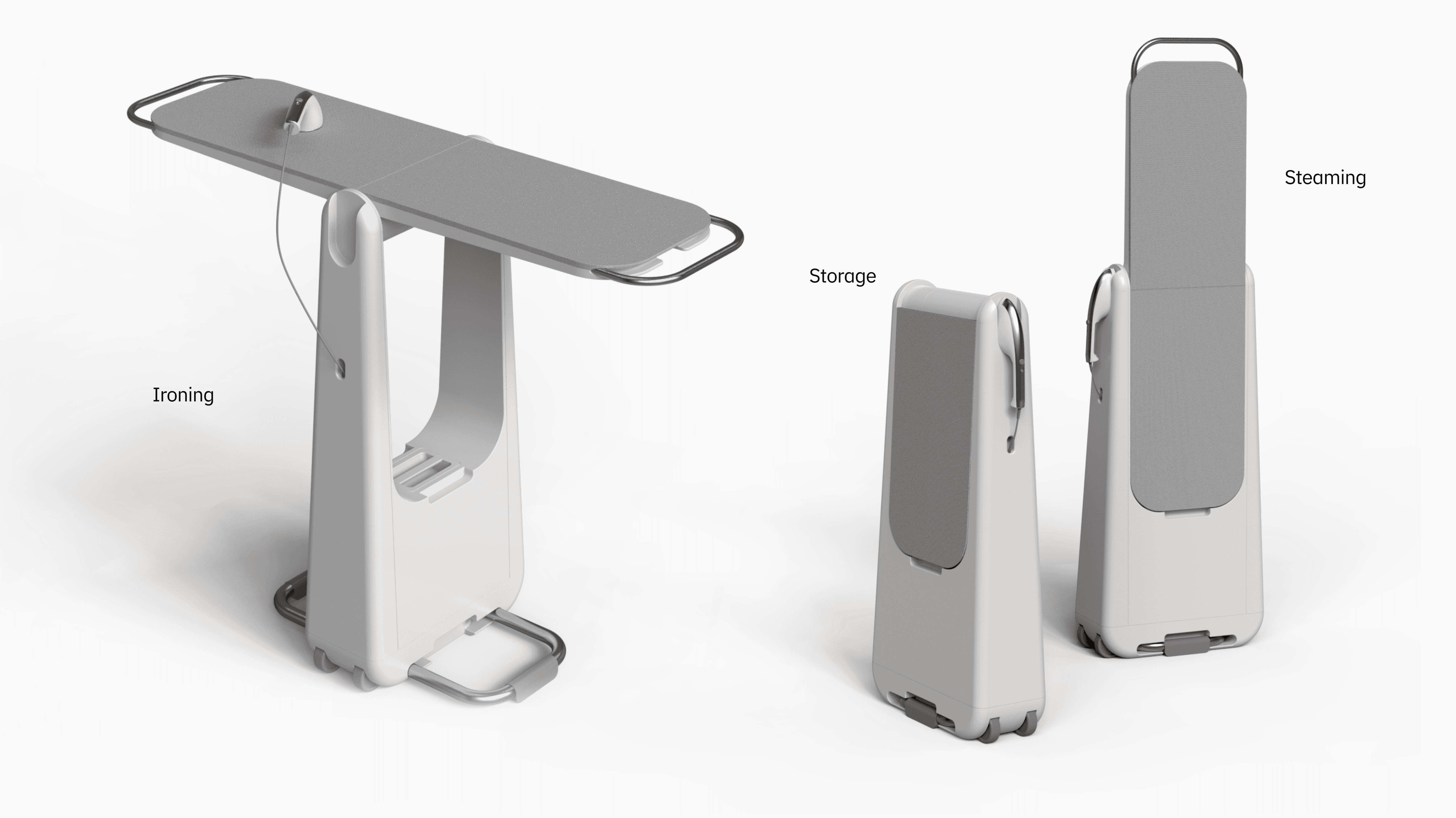 Using Rhino as a tool to develop our sketches allowed us to work though problems as they arose. Wheels allow the steamer to become a handle to walk the system around, the water tank is stored in the low in the base of the ironing board increasing stability, especially when paired with collapsable support legs. The ironing surface lays flush when stored and can be set to different modes depending on the users needs.