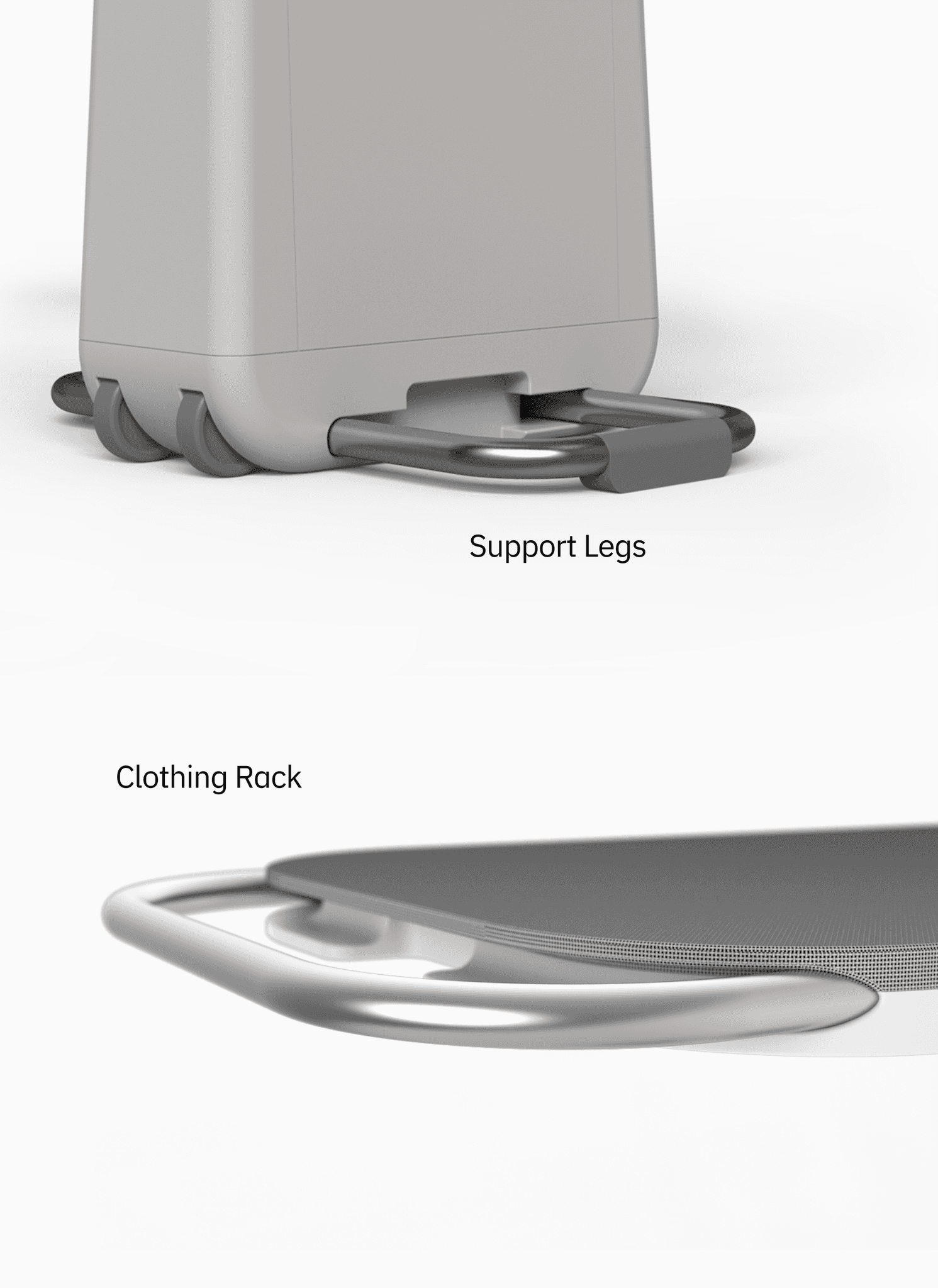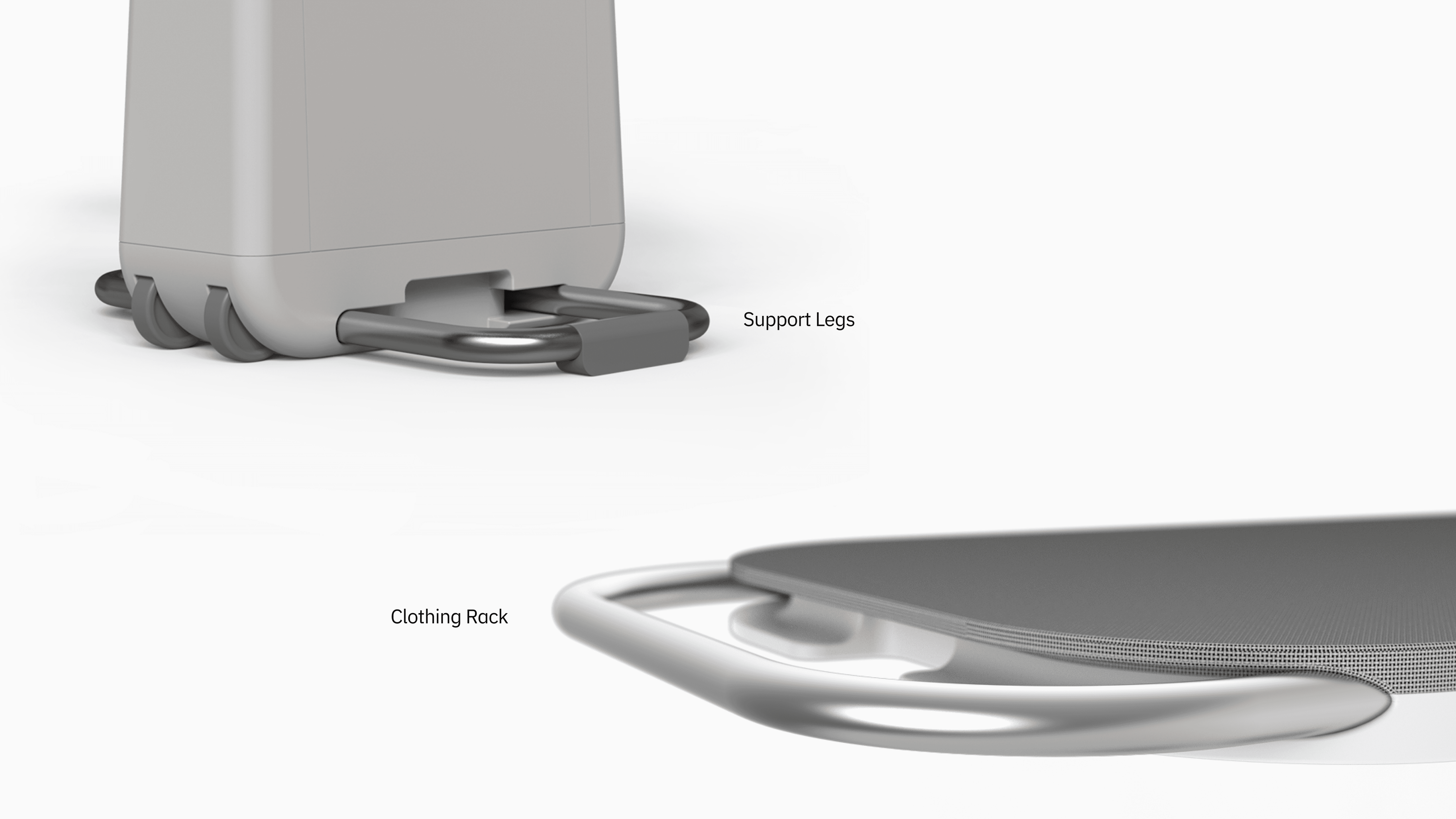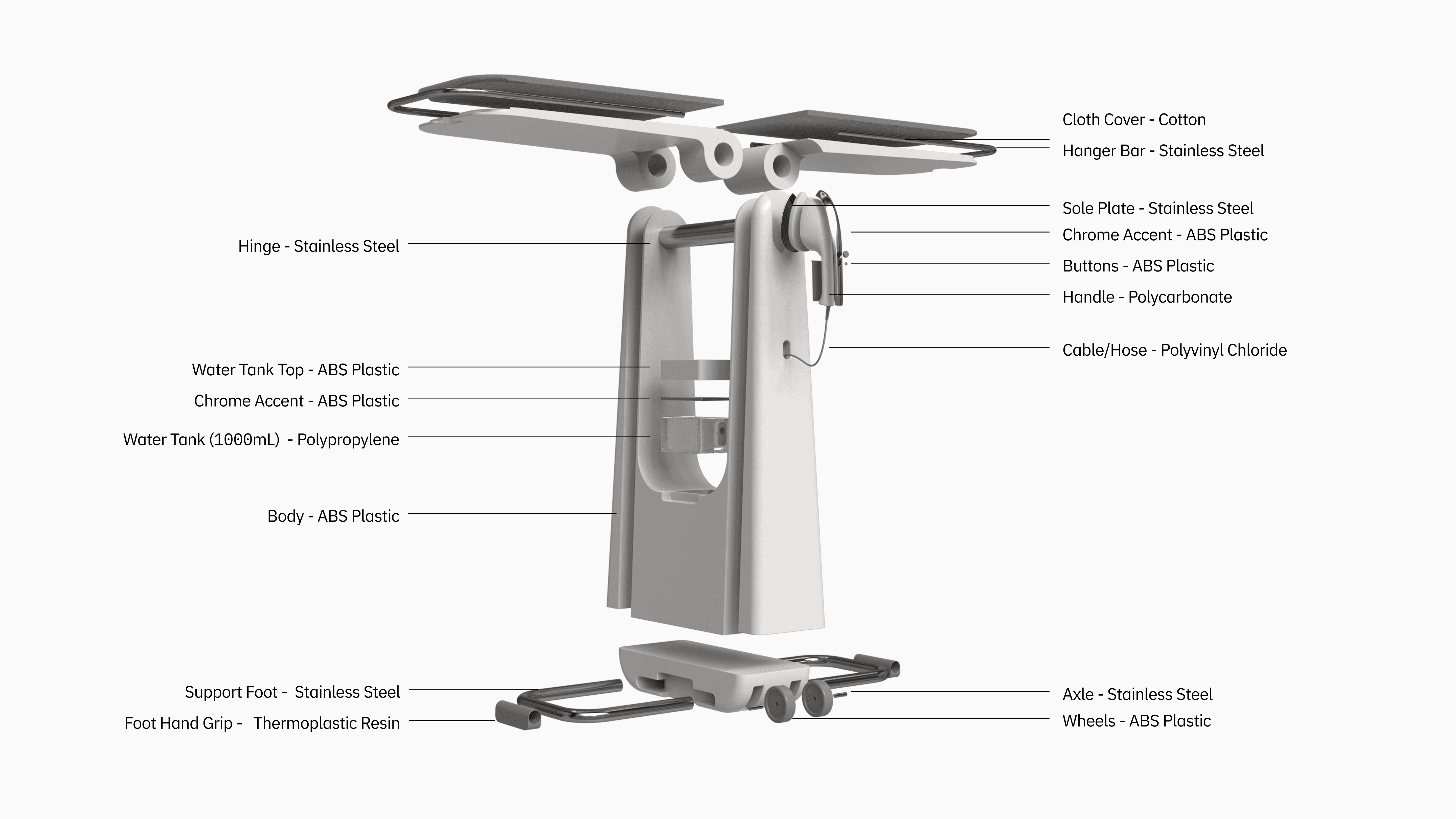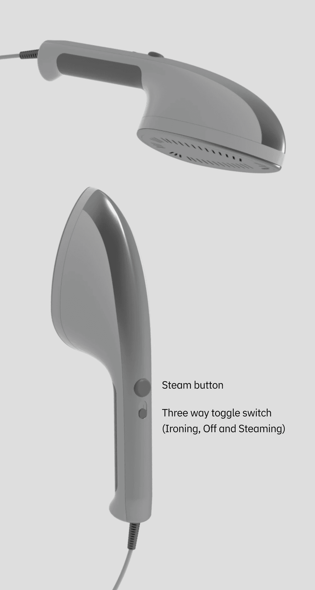 Using Rhino as a tool to develop our sketches allowed us to work though problems as they arose. Wheels allow the steamer to become a handle to walk the system around, the water tank is stored in the low in the base of the ironing board increasing stability, especially when paired with collapsable support legs. The ironing surface lays flush when stored and can be set to different modes depending on the users needs.