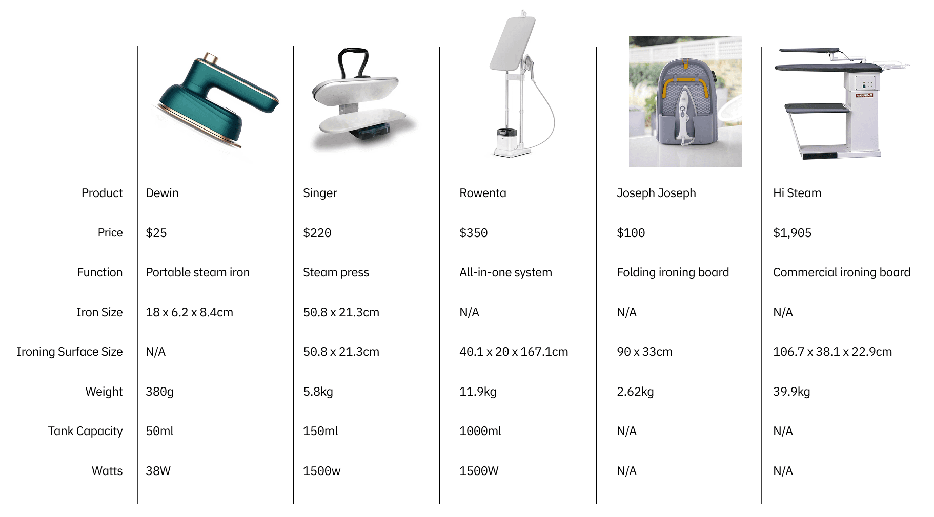 Looking at existing products within ironing and steaming, helped narrow down our audience and how Steamline can fit into the market. The two existing products that stood out to us were Rowenta and Joseph and Joseph, both systems were all in one, helping organization and setup.