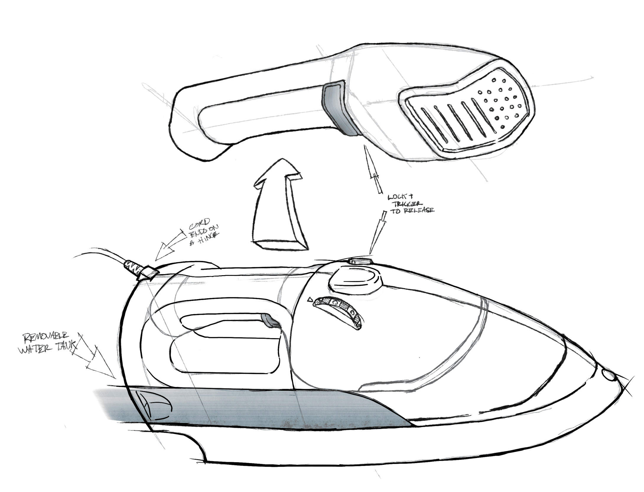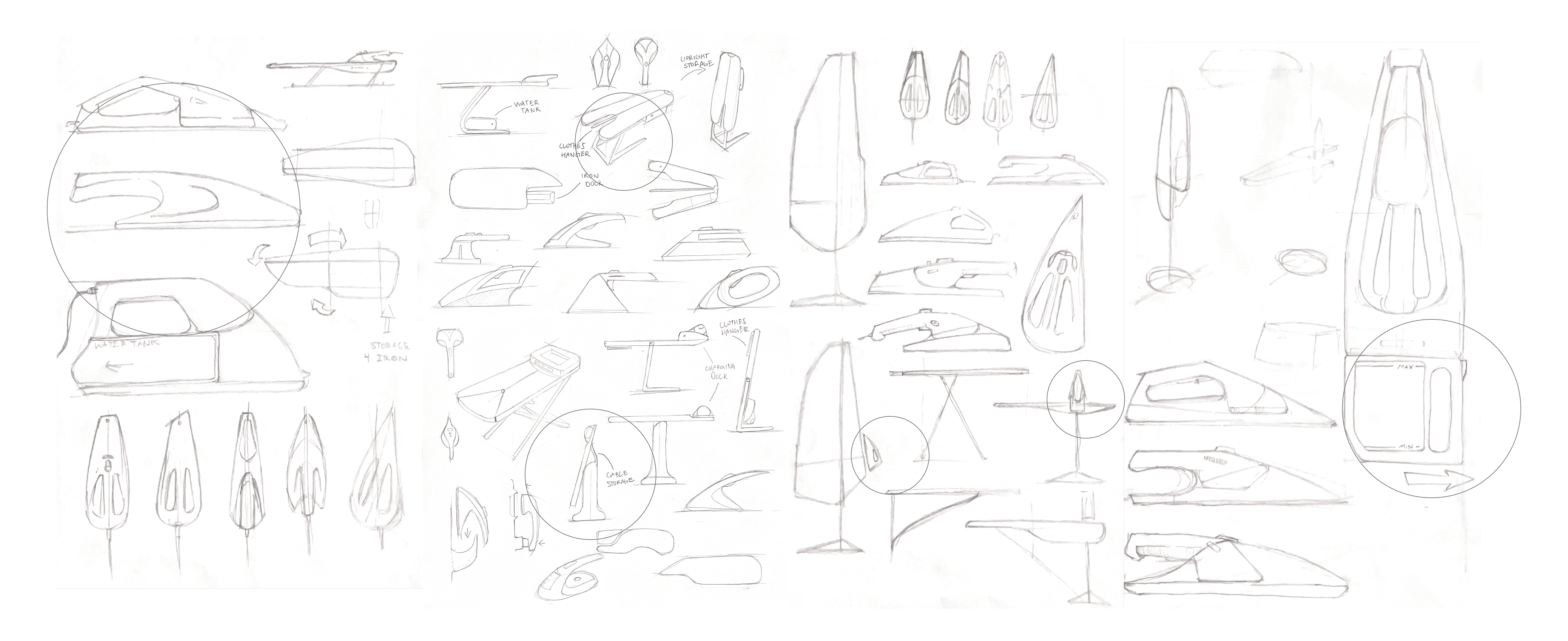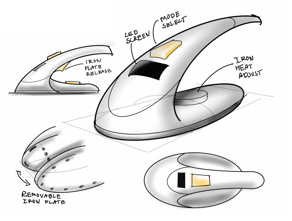 Rapid visualization sketches allowed us to explore ideas to solve problems without focusing on form. From these sketches we knew we wanted to add a built in dock to protect hot surfaces, a clothes rack to support large ironing or steaming tasks, and a separate water tank from the steamer iron making the process of refilling quick and easy.