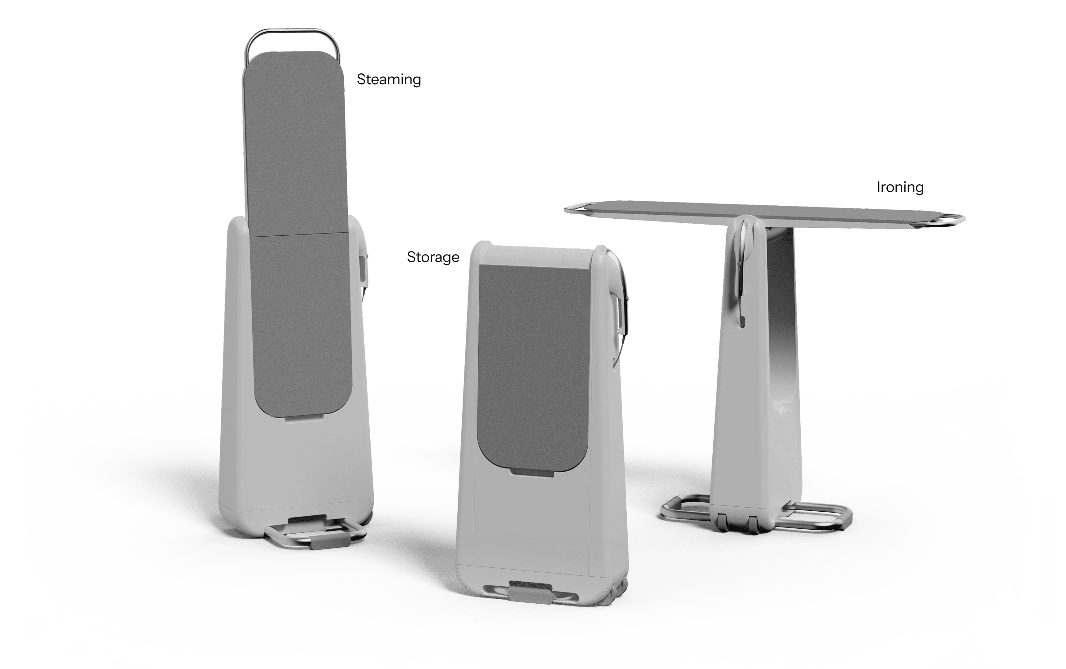 Adjustable boards that lock into three configurations: compact storage, ironing board, and steaming hanger.