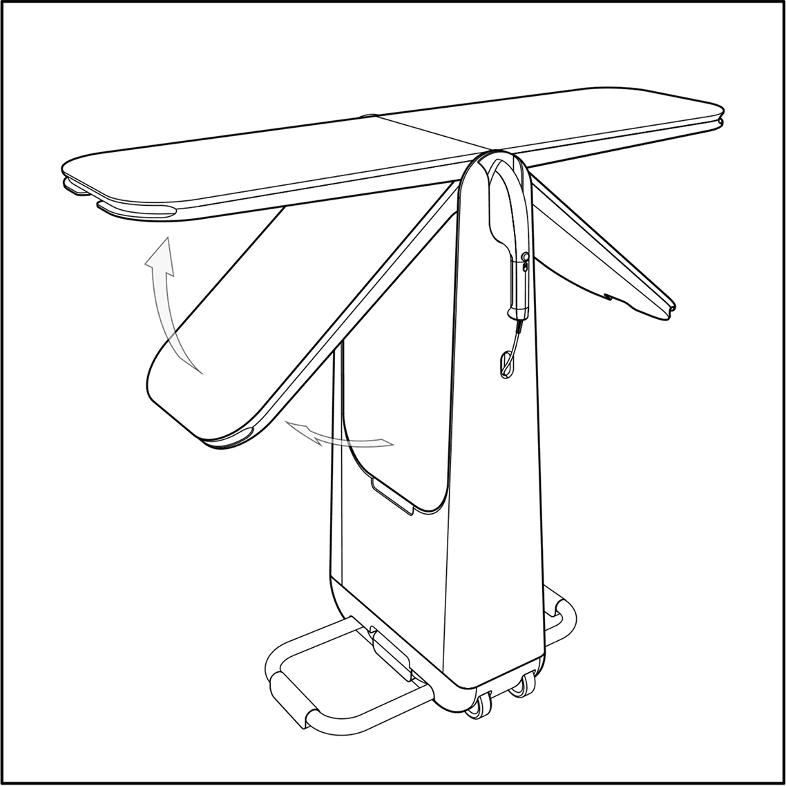 It features three configurations with the rotating boards; steaming, storage, and ironing.